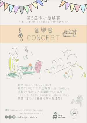 《⼩小敲擊襄》 將給予學員感受一下音樂分享與敲擊樂隊的演出經驗。 來⾃本港多間學校的敲擊⼩樂樂手將會共同演出⼀系列列經典敲擊樂作品,可讓大家於暑假前總結⼀年的學習成果。⼩小敲擊襄是一個培育未來敲擊樂手的獨特實驗平台。由具豐富演出經驗的樂手帶領專門排練和指揮,讓學習樂器的一代小新星與敲擊樂手同場互相觀摩和學習。