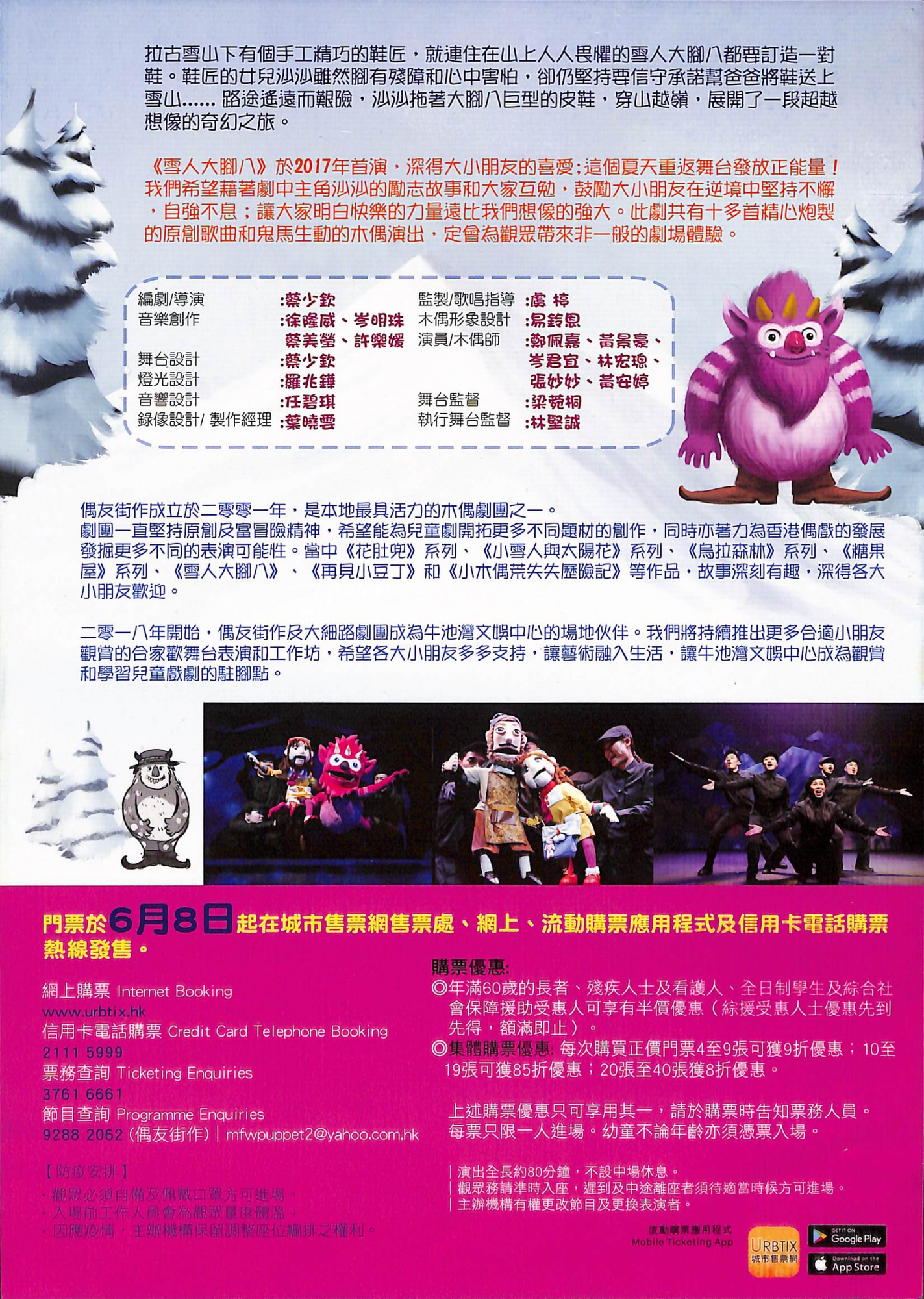 《雪人大腳八》於2017年首演,深得大小朋友的喜愛;這個夏天重返舞台發放正能量! 我們希望藉著劇中主角沙沙的勵志故事和大家互勉,鼓勵大小朋友在逆境中堅持不懈,自強不息;讓大家明白快樂的力量遠比遠比我們想像的強大。此劇共有十多首精心炮製的原創歌曲和鬼馬生動的木偶演出,定會為觀眾帶來非一般的劇場體驗。