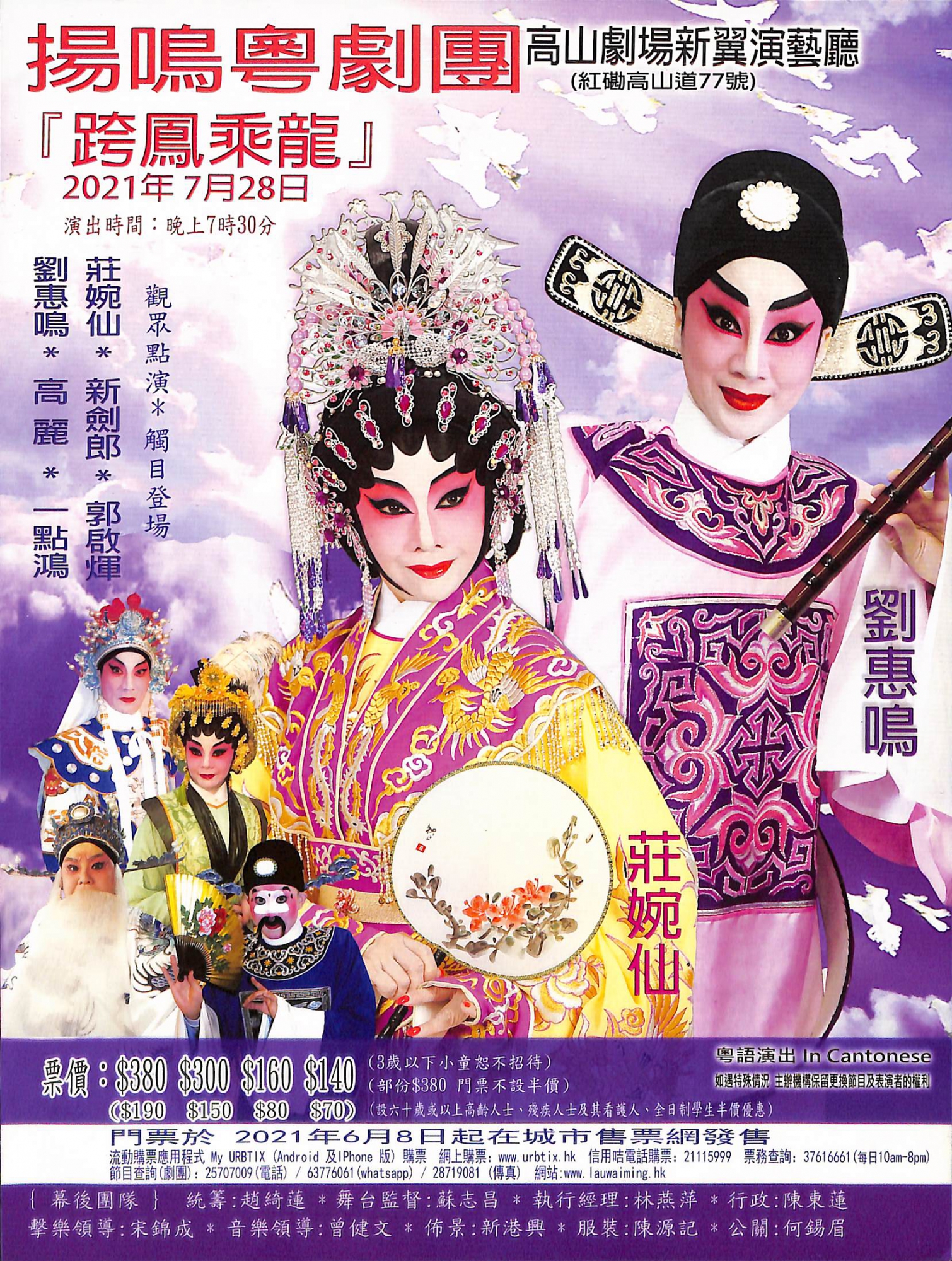 喜劇 [跨鳳乘龍] 為任白波名劇, 亦是近年香港較少上演的劇目, 今次由名伶劉惠鳴﹑莊婉仙合演, 兩位擅演前輩任劍輝和白雪仙的戲路, 扮演蕭三和弄玉公主, 笑話連編, 不能錯過。