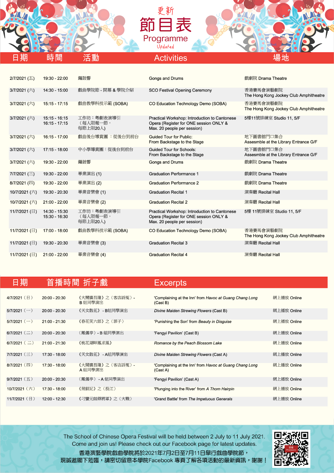 戲曲學院將在7月2日起一連10天舉辦首屆「戲曲學院節」,讓喜愛戲曲的觀眾於這期間欣賞多元的節目,包括學期重點演出《鑼鼓響》、畢業演出、音樂會和粵劇工作坊等。另外,九齣預先錄影的折子戲將於網上首播,分享同學的學習成果,與眾同樂!