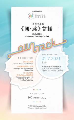 1/音樂錄像及紀錄片放映-十周年原創作品《同路》音樂錄像首播,並首映同調合唱團 2019 年在東京手牽手音樂節所拍攝的紀錄片,由影像帶領你了解合唱團團員一直走來的挑戰和關口。