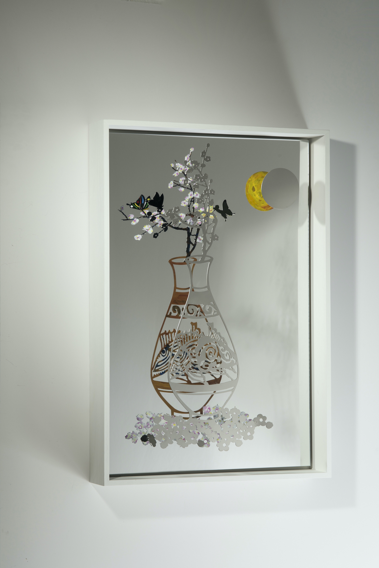 每件作品都有一面鏡子作為背框,提供了另一種欣賞金的雕塑的方式。在視線水平上, 圖像看起來不是黑就白的,只有從不同的角度看著反射在鏡子的影像時,才會看到把雕塑再現的彩色版本。與藝術家平時大多的作品不同,這些作品都富有多種且明 亮的色彩,增添了一重現代感,。金的雕塑再次將我們的目光帶離了雕塑的範圍,這 一次從多樣線條延伸到作品本身創造的鏡像。