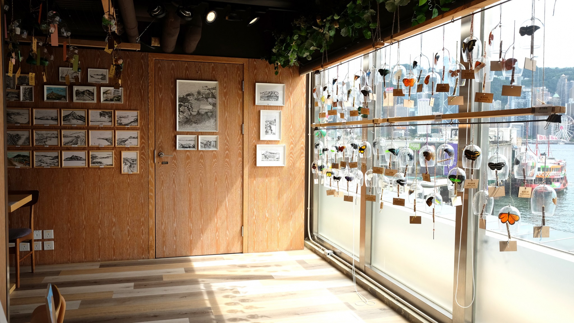 於透明物料及畫紙上繪畫了香港山嶺及本地蝴蝶品種,