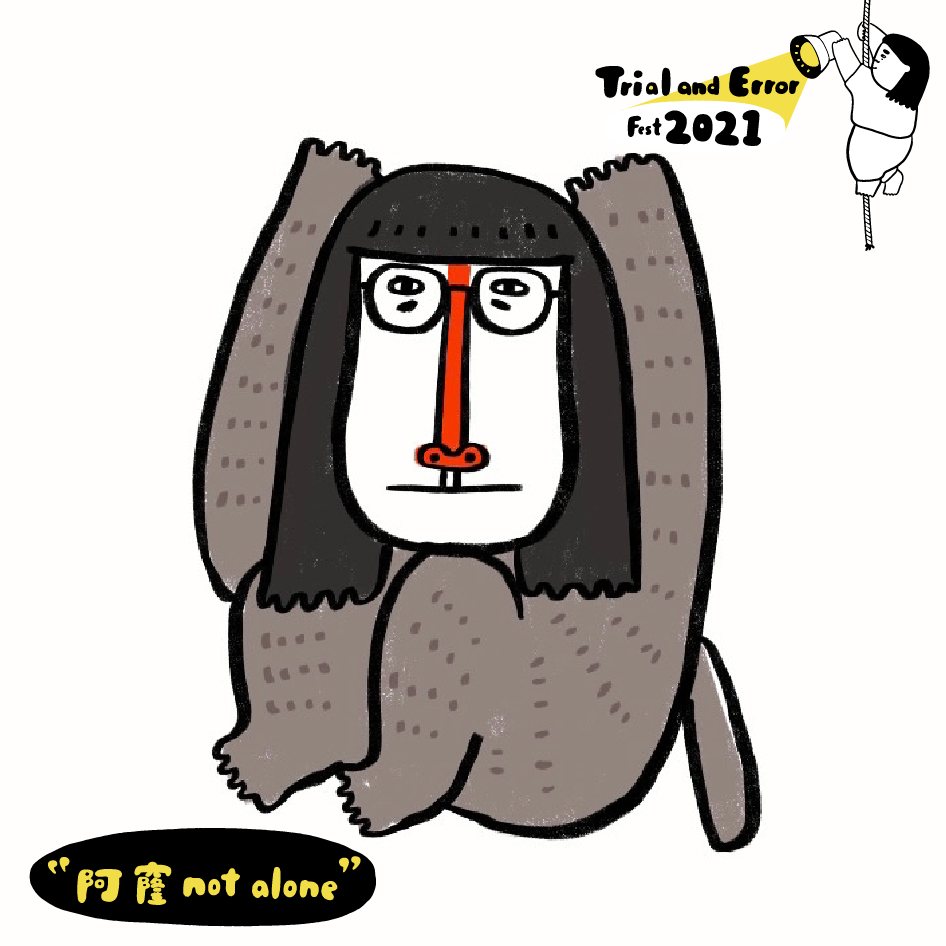 Trial and Error Lab共同創辧人之一王育娟(阿絹),內心是一個動物園,其中「狒狒」代表她緊張的情緒。自從2016年10月起,Trial and Error Lab開辦的那一天開始,直至今年7月,她心中的「狒狒」跑了出來57個月,再也沒有回到動物園的山窿裡。