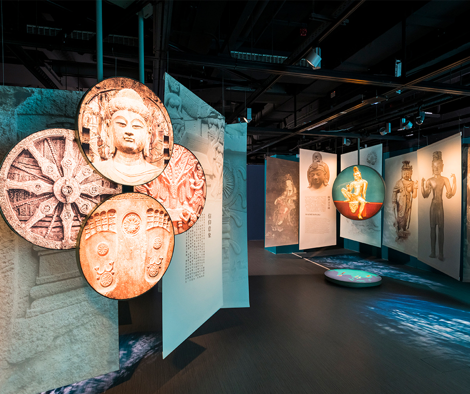 - 3D虛擬佛教雕塑旋轉模型:10件3D虛擬雕塑以3D攝影測量法製作,由一系列55寸垂直LEC/LED屏幕展示,高解像度的模型徐徐旋轉。當中有些雕塑為佛教傳播的敘事及藝術史的知識,都作出了重大貢獻。其中包括印度阿育王雄獅石柱、紀念佛陀生平八件重要事蹟的佛傳圖。這些文物珍寶對其國家意義重大,大多不能運到外地展出。此數碼收藏不但創新,更是世界首創。