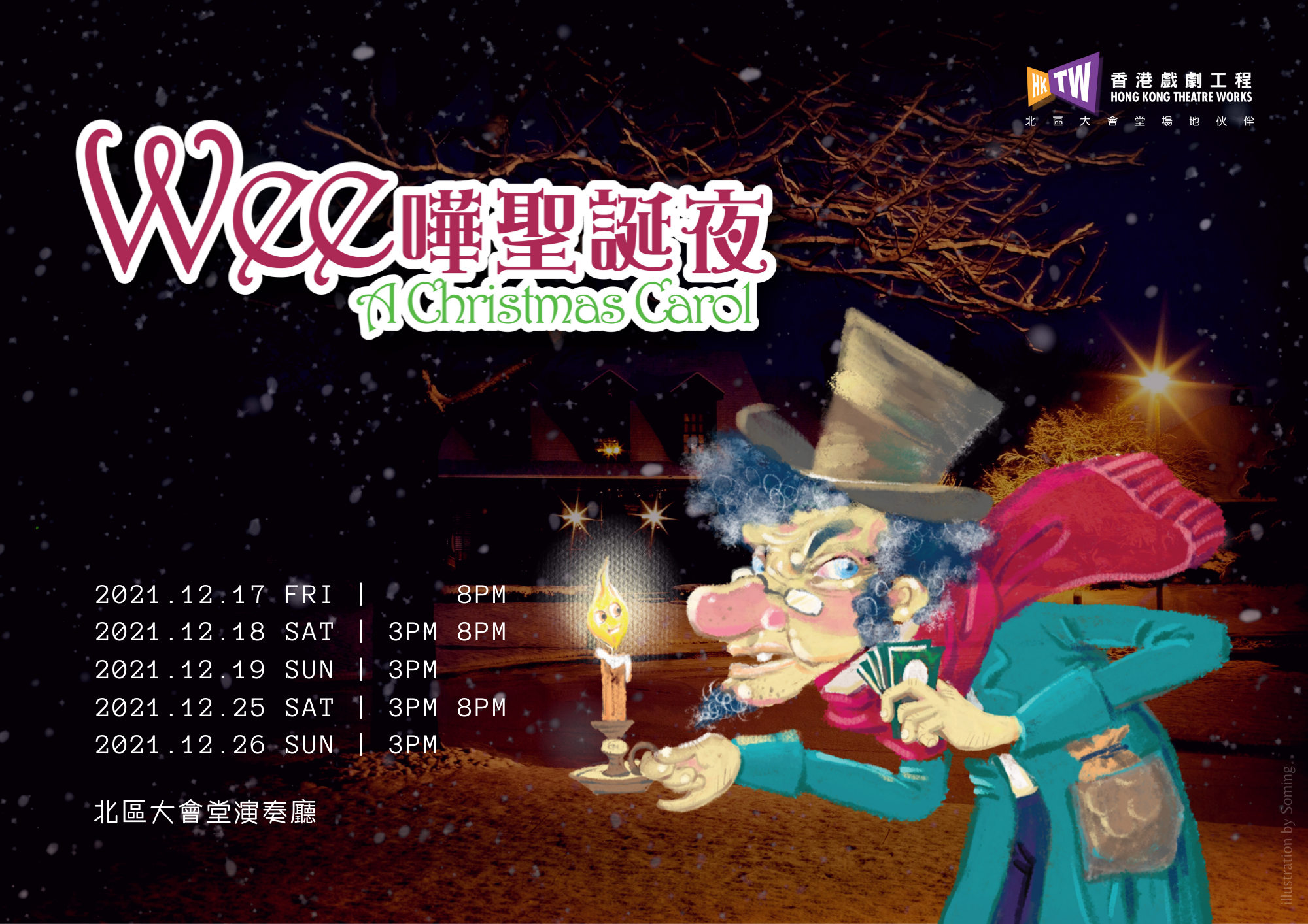 一毛不拔尖酸刻薄孤寒醃尖腥悶的老闆Scrooge今次真是倒霉了,聖誕夜竟然遇到三位wee嘩精靈,嚇到這位公認「庹縮怪」大呼小叫。三位精靈不請自來,究竟有何目的?「庹縮怪」又能否平平安安度過平安夜?劇目改編自狄更斯的小說《聖誕頌歌》(A Christmas Carol),今年全家走入劇場,過一個wee嘩聖誕夜。