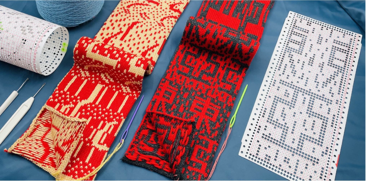在三小時的工作坊內,參加者將學會手搖針織機的基本運作,用於創造專屬自己的圍巾。工作坊的設計素材為預先準備的打孔卡,參加者將因應個人喜好,利用打孔卡的排序而造出不同的圖案,並以自己挑選的紗線織布;工作坊的設計靈感來自「再紡東亞系列一:手中的羅盤」展覽主視覺所展示的字體設計及呈現的亂碼概念。工作坊亦將會教授如何妥善修飾、清洗及保養圍巾。