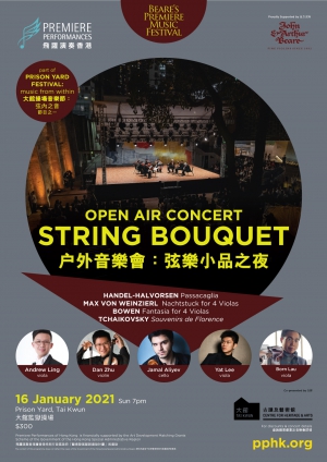 以港島半山的繁華作背景,涼風吹拂下欣賞弦樂小品,賞心悦目。這個節目所選奏的弦樂作品猶如繁花錦簇,由炫技的韓德爾/哈佛森二重奏,到兩首華麗的中提琴四重奏,到喜樂的柴可夫斯基六重奏,均為小提琴、中提琴及大提琴這些不朽的弦樂器喝采。