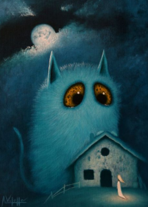 Working under the Surrealist automatism method, like his innovative predecessors, Vilella creates his paintings without any previous sketches or ideas. Instead, each work is painted from his subconscious mind as he accesses his material. From this process, he created his big eyed characters, who are spirits that came to his mind, introducing their dream-like world to the audience. In the artist's own words, "I don't choose my characters... in some way they choose me."