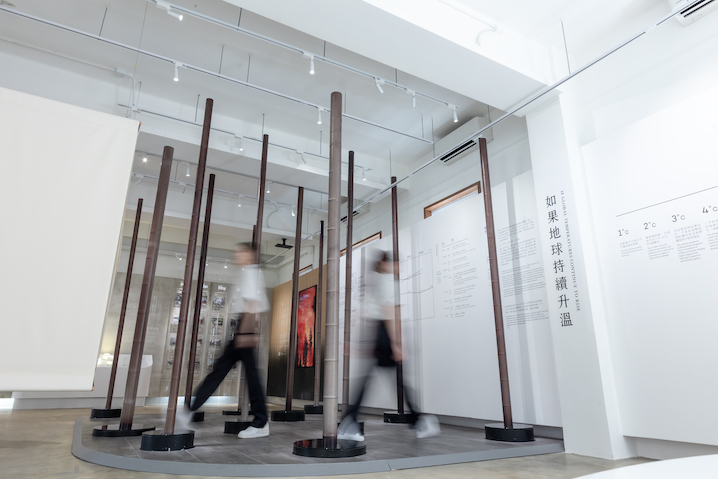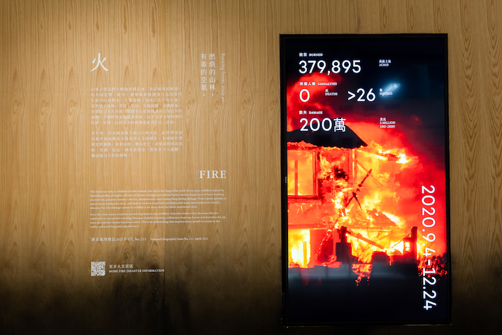 開幕展《共知・共識・共行》以研究數據,配合不同的視覺、短片、音效裝置與展品,呈現風災、水災及水源污染、山林大火及人類行為在大地留下的災難性烙印撼動訪客的身心靈。