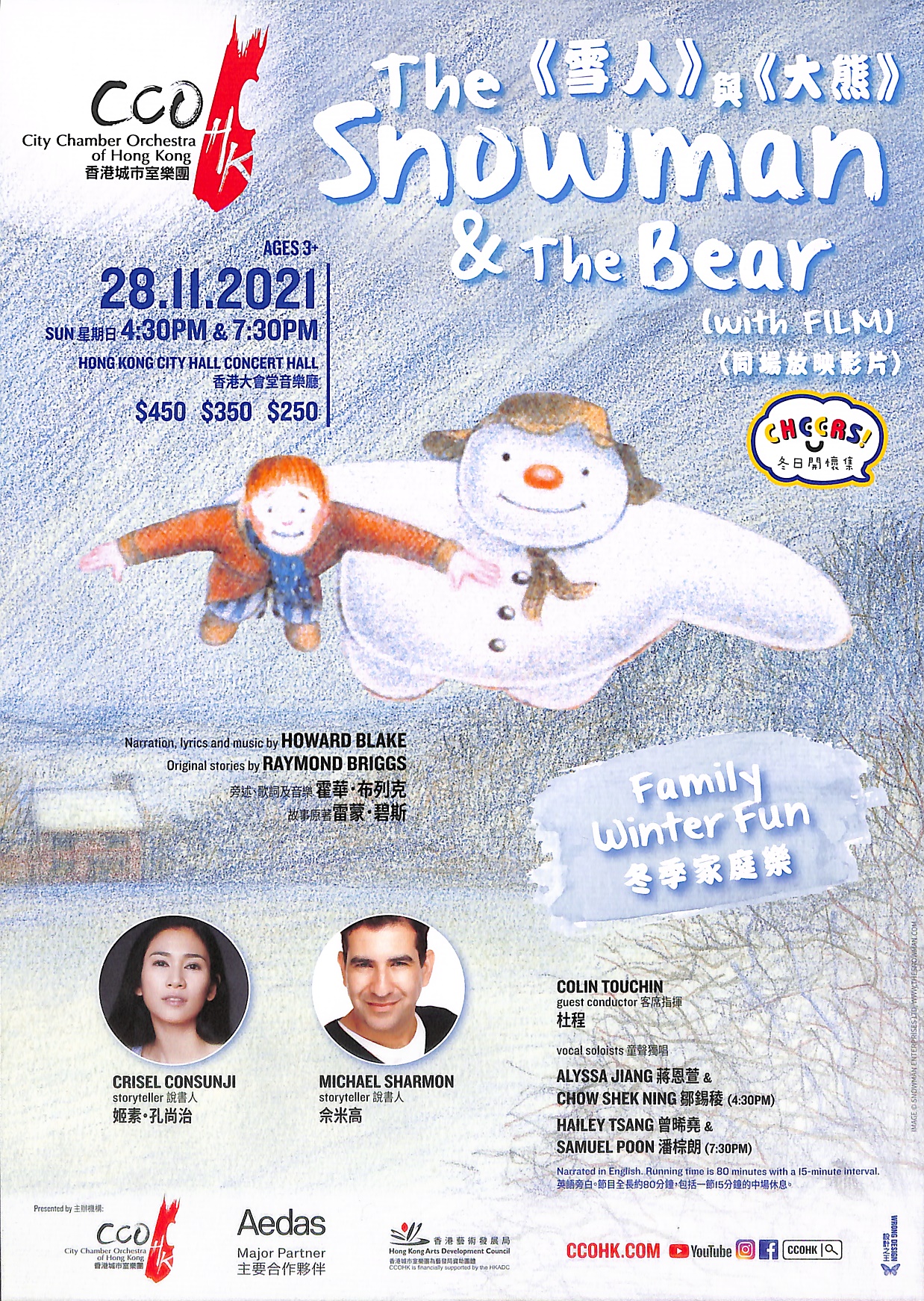 冬季家庭樂齊來與《雪人》與《大熊》一起迎接冬季的來臨!這兩套可愛感人的動畫源自雷蒙‧碧斯膾炙人口的故事,配上霍華‧布列克的音樂, 由香港城市室樂團現場演奏。演出更有生動的旁白及歌唱,透過大銀幕帶領觀眾進入如夢如幻的世界。