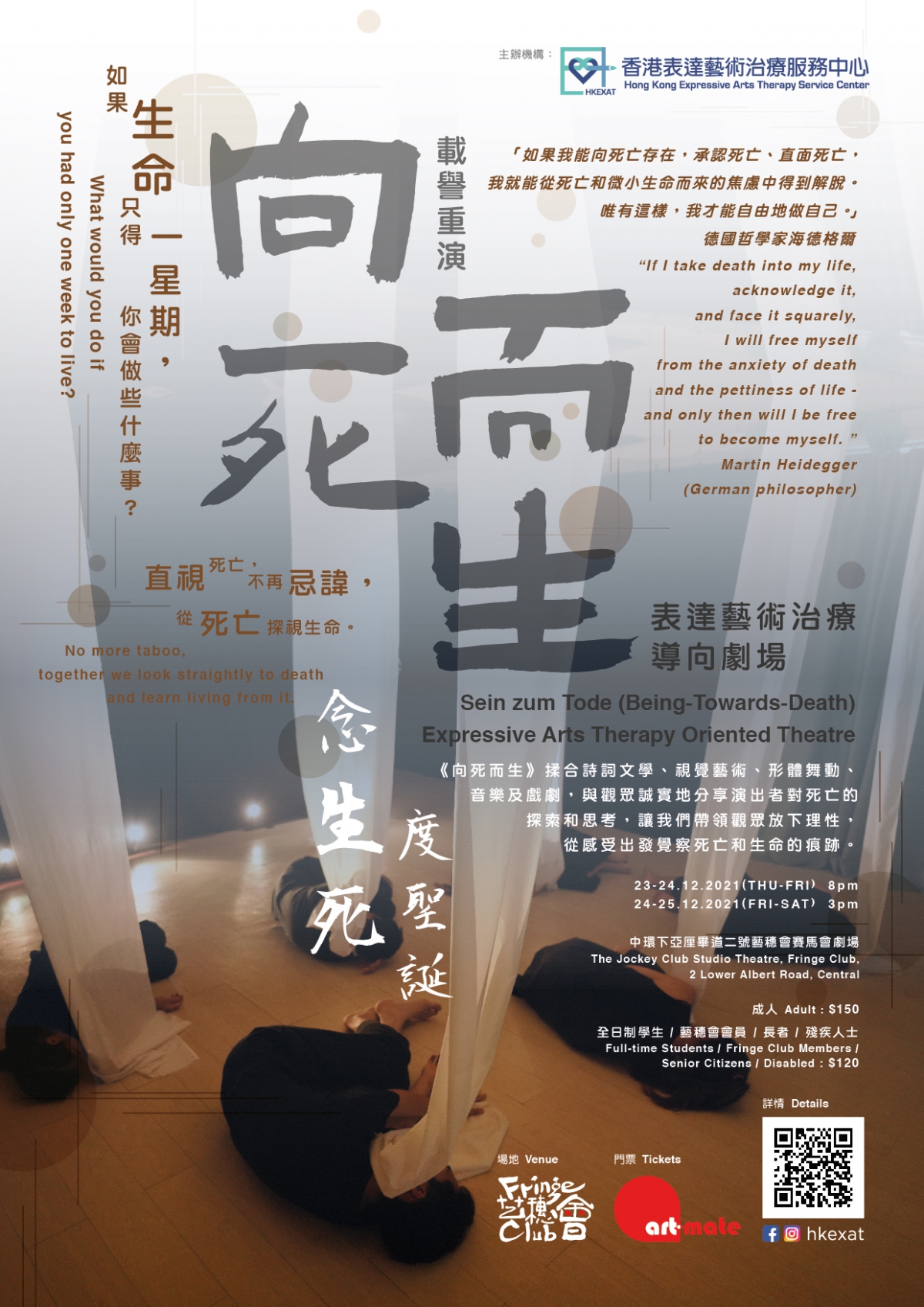 《向死而生》揉合詩詞文學、視覺藝術、形體舞動、音樂及戲劇,與觀眾誠實地分享演出者對死亡的探索和思考,讓我們帶領觀眾放下理性,從感受出發覺察死亡和生命的痕跡。