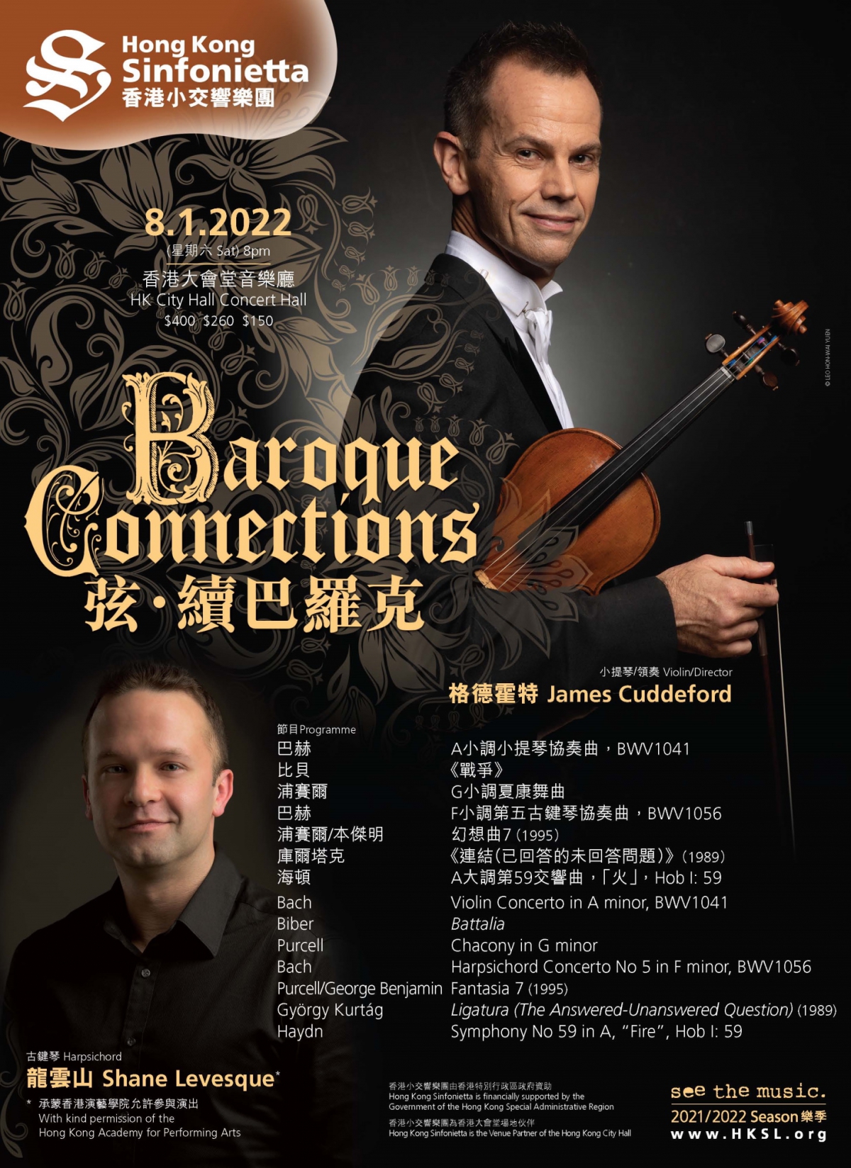 承接7月份的「巴赫意象」音樂會,香港小交響樂團樂團首席格德霍特再度相約樂迷於2022年1月,分享由他細意編排之音樂會「弦‧續巴羅克」, 延伸巴羅克的獨特風韻。他不但帶領樂團弦樂組於音樂會中穿梭多首來自巴赫、比貝、浦賽爾的樂章,更會配搭當代作曲家庫爾塔克的作品,且看於歷史洗禮過後,可會找到古今音樂互相映照的音程。音樂會特別邀得著名古鍵琴家龍雲山演出,演繹巴羅克的音樂美學。