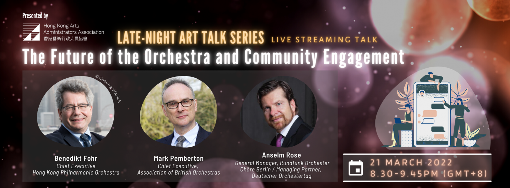 In March 2022, HKAAA is presenting the returning talk production "Late-night Art Talk Series", with international orchestra directors discussing on the topic "The Future of Orchestras & Community Engagement".