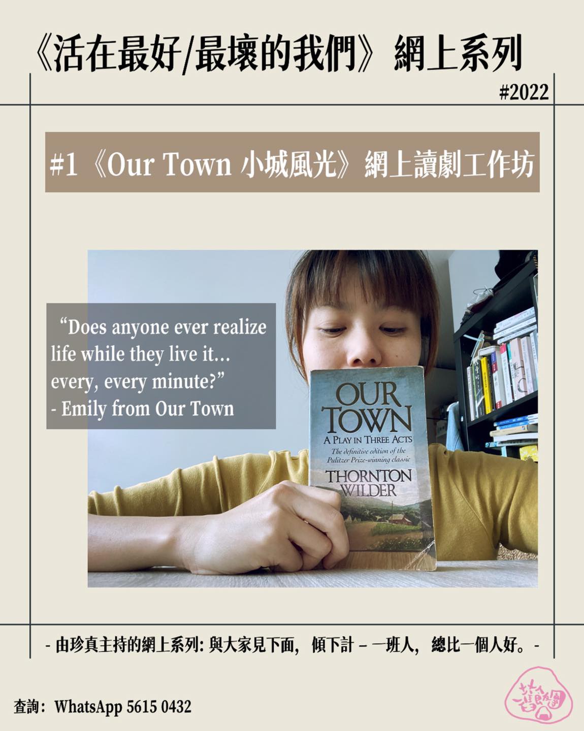 珍真以經典舞台劇作品《Our Town 小城風光》作主軸,透過各種創意互動的遊戲、分享及選段讀劇,於Thronton Wilder的文字間一起發掘、一起經歷、一起尋找面對現實的出口。