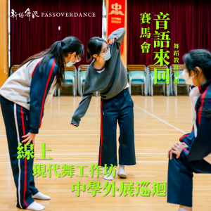 「現代舞工作坊 —— 中學外展巡迴」將在本港中學、舞蹈學校、社區中心等進行外展巡迴。工作坊由一位編舞家和一位不同媒介的藝術家(戲劇/音樂/文字/視覺藝術)一同帶領。