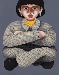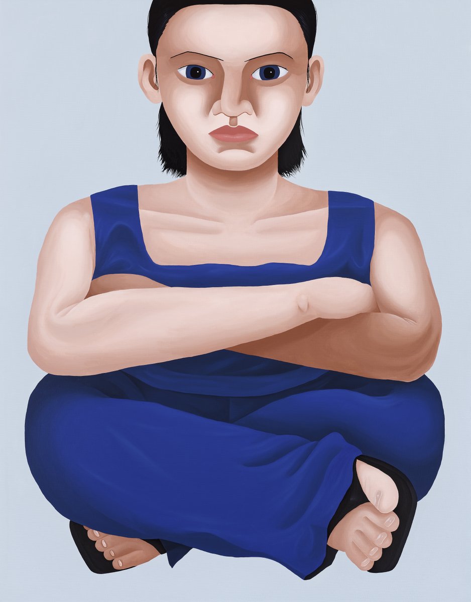 他作品中的個體專注地凝視著觀者,似乎在等待觀者重新注視他們的眼睛,從⽽與表象之下的根蒂建⽴聯繫。然⽽,在將他畫中的⼈物設置在相同的姿勢和空間中時,他探索了我們如何截然不同,但在本質上是相同的。其中⼀些肖像引⽤了藝術家本⼈和他的熟⼈,⽽另⼀些則基於陌⽣⼈的⾯孔。