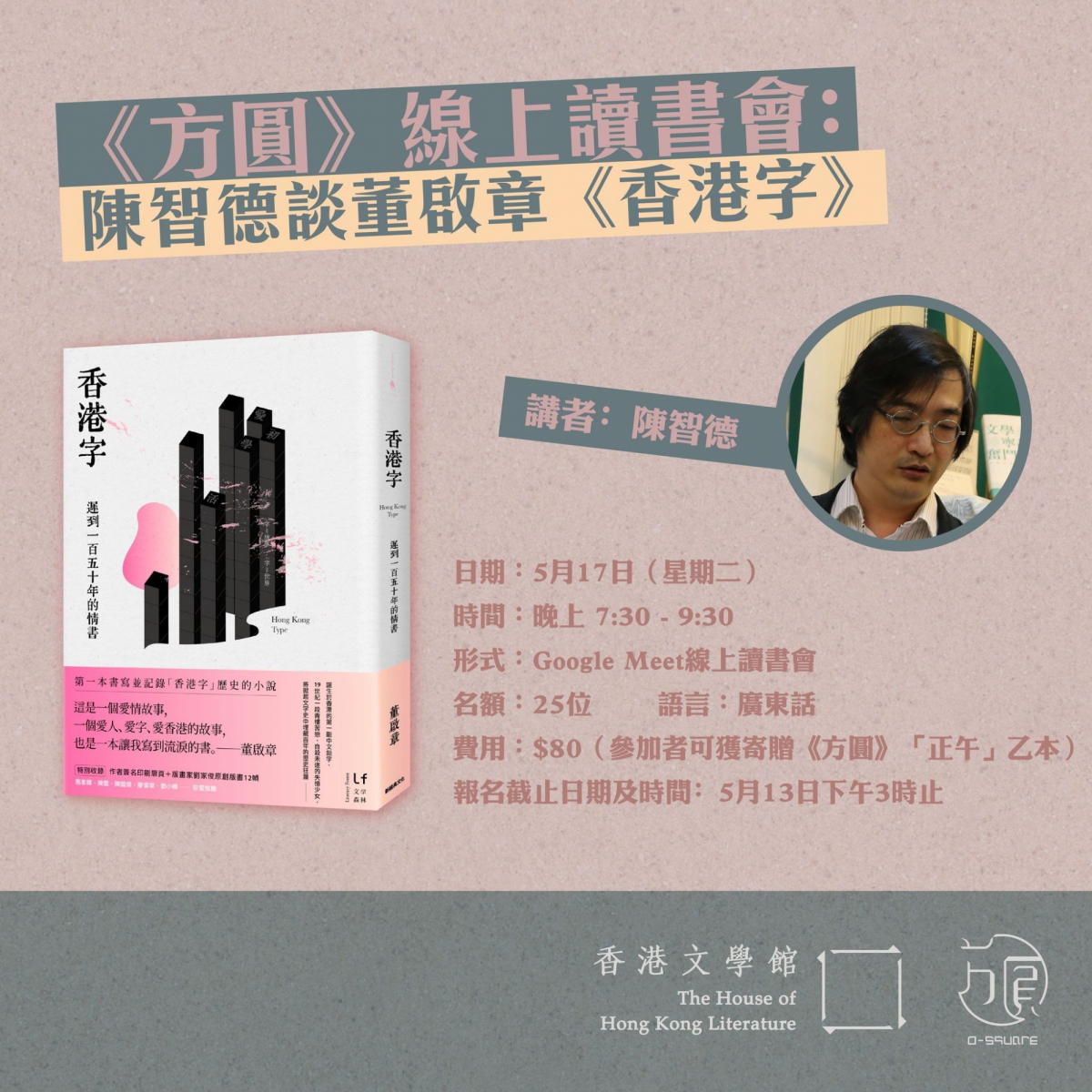 距離上一部長篇作品《後人間喜劇》不過一年時間,董啟章再度交出新作《香港字》。《方圓》請來學者兼作家陳智德,以「正午」為切入點,看《香港字》中呈現的香港故事。 在正午時分,太陽處於日照最高峰位置,烈日當空,一如盛極一時的昔日香港,隨太陽落下,城市的命運亦一同步向黃昏。陳智德與董啟章為同樣經歷過香港「正午」的同代人,藉著《香港字》的出版,陳將引領我們作歷史的回望,探討活下去的可能。 語言:廣東話報名截止日期及時間﹕5月13日下午3時