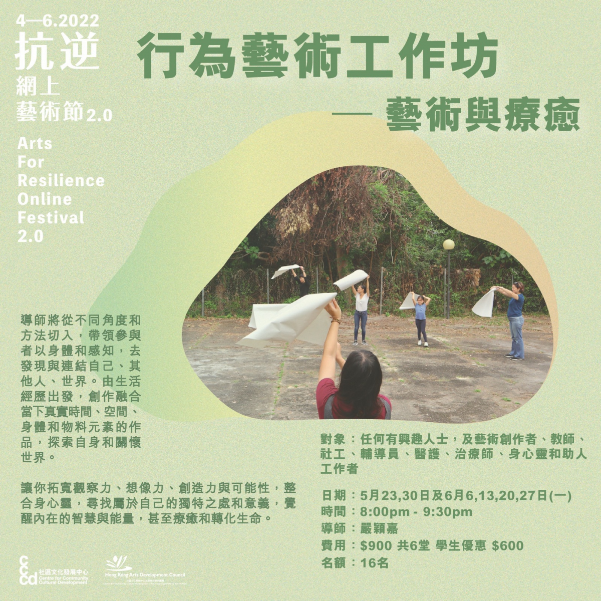 對象 Target: 任何地域有興趣⼈人⼠士,包括藝術創作者、教師、社⼯工、輔導員、醫護、治療師、⾝身⼼心靈 和助⼈人⼯工作者