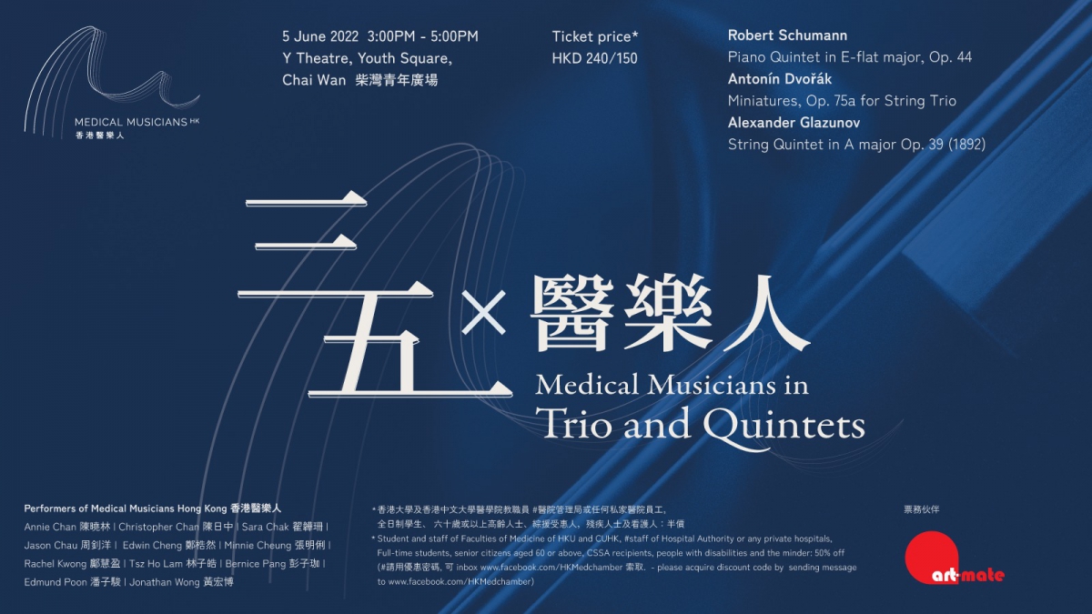 三名見習醫生 。兩名畢業生。 一群醫學生 。三五知己。 三五成群。三重奏。五重奏。德伏札克。舒曼。格拉祖諾夫。香港醫學室樂團 -》香港醫學人。六月五號星期日下午三時。恭候。柴灣青年廣場Y 綜藝館。有得玩,梗係玩。 舒曼 - 降E大調鋼琴五重奏,作品編號44德伏札克 - 三重奏小品集,作品編號75a格拉祖諾夫 - A大調弦樂五重奏,作品編號39