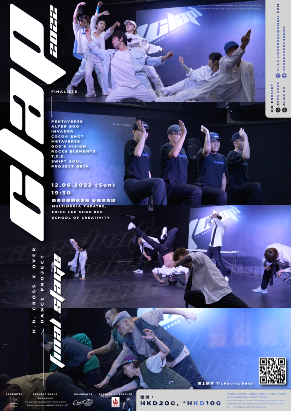 《CLAP 2022》為「香港比舞Hong Kong Dance Exchange(H.D. X)」聯合一眾本地著名街舞舞者合作舉辦的舞蹈創作比賽。以全新角度創作出跨越舞種界限的作品,演繹出獨特精彩的本地舞蹈作品,驚艷本地及海外一眾舞蹈及藝術愛好者。比賽分為四個階段。首階段招集眾多本地舞者組隊參賽;第二階段初賽已於2022年5月選出十隊優秀本地舞隊出線;第三階段決賽將於2022年6月舉行。
