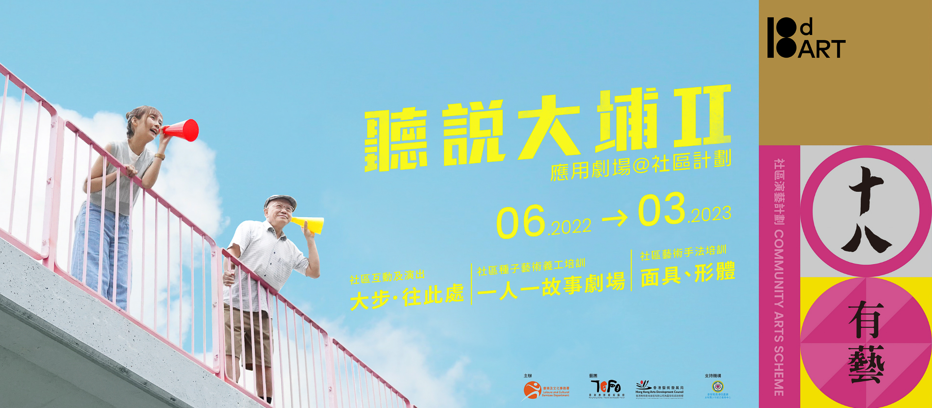康文署與基督教香港信義會太和青少年綜合服務中心合作,在大埔區推行「十八有藝」社區演藝計劃,透過可延續及深化的活動在區內推廣表演藝術,讓市民觀賞之外,更可以參與其中,親身體驗藝術如何令大眾與社區更有活力。