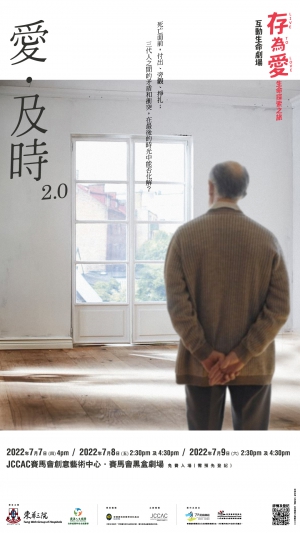 互動生命劇場《愛•及時》由東華三院「圓滿人生服務」委約「7A班戲劇組」製作,於2017年首次上演,反應熱烈,今次2.0版本以論壇劇場的互動手法,帶出家庭裡如何面對生離死別及過程中的掙扎,在搶救與放棄治療之間如何取捨?題材貼近生活,觀眾可近距離體會劇中人物的情緒和困境,在主持人引領討論下,除可以發表意見和表達感受外,更有機會參與演出,運用集體智慧和經驗改寫劇情、影響故事結局。透過戲劇激發觀眾從不同角度思考,易地而處了解家庭中不同角色的考慮和困難,鼓勵觀眾與其家人和照顧者有更多的交流,及早討論預設醫療指示等晚期照顧安排的議題。