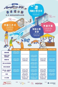 D2 Place 作為寵物友善的本地商場之一,特意為活潑好動的狗狗們在一期天台舉辦「狗狗水戰派對」,場地設有數個小水池、噴水裝置及沙灘主題打卡點,公眾可免費借用精美道具為狗狗打造夏日形象,留下與毛孩共度炎夏的難忘時光!