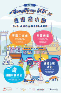 D2 Place 再度與一眾熱愛泰國文化的「泰二代」,於 2022年 8 月 5 日至 9 日,呈獻一連五日「香港潑水節 2022」!D2 Place 將搖身一變「小泰國」,舉辦超過十項精彩活動,除了水龍王祈福、許願、泰國工作坊、供僧及泰國特色市集等活動外,當然還有重點的「潑水」環節!今年除了「激 FUN 水戰派對」,大會更為一眾毛孩增設「狗狗水戰派對」,狗狗們可獨享天台寵物花園,體驗刺激水戰!