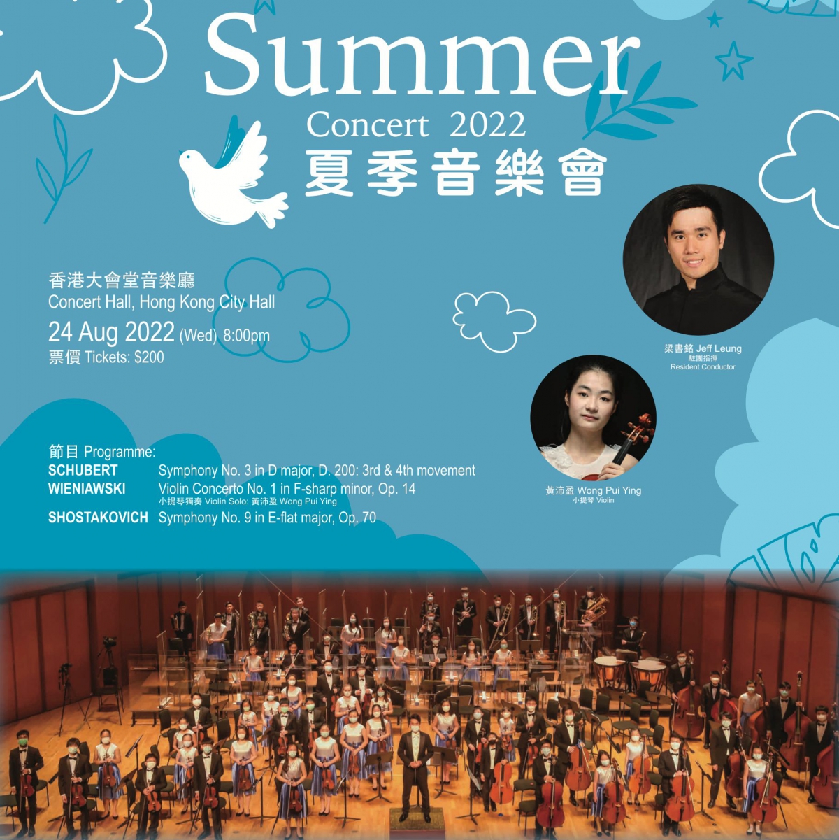 把握短暫的暑假,獲選加入夏季樂團工作坊的莫札特團和貝多芬團團員現積極籌備 Schubert 和 Shostakovich 交響曲,同場音樂會亦有將到歐洲進修小提琴專業的黃沛盈演奏極具挑戰的 Wieniawski Violin Concerto No.1 ,不要錯過精彩的演出!