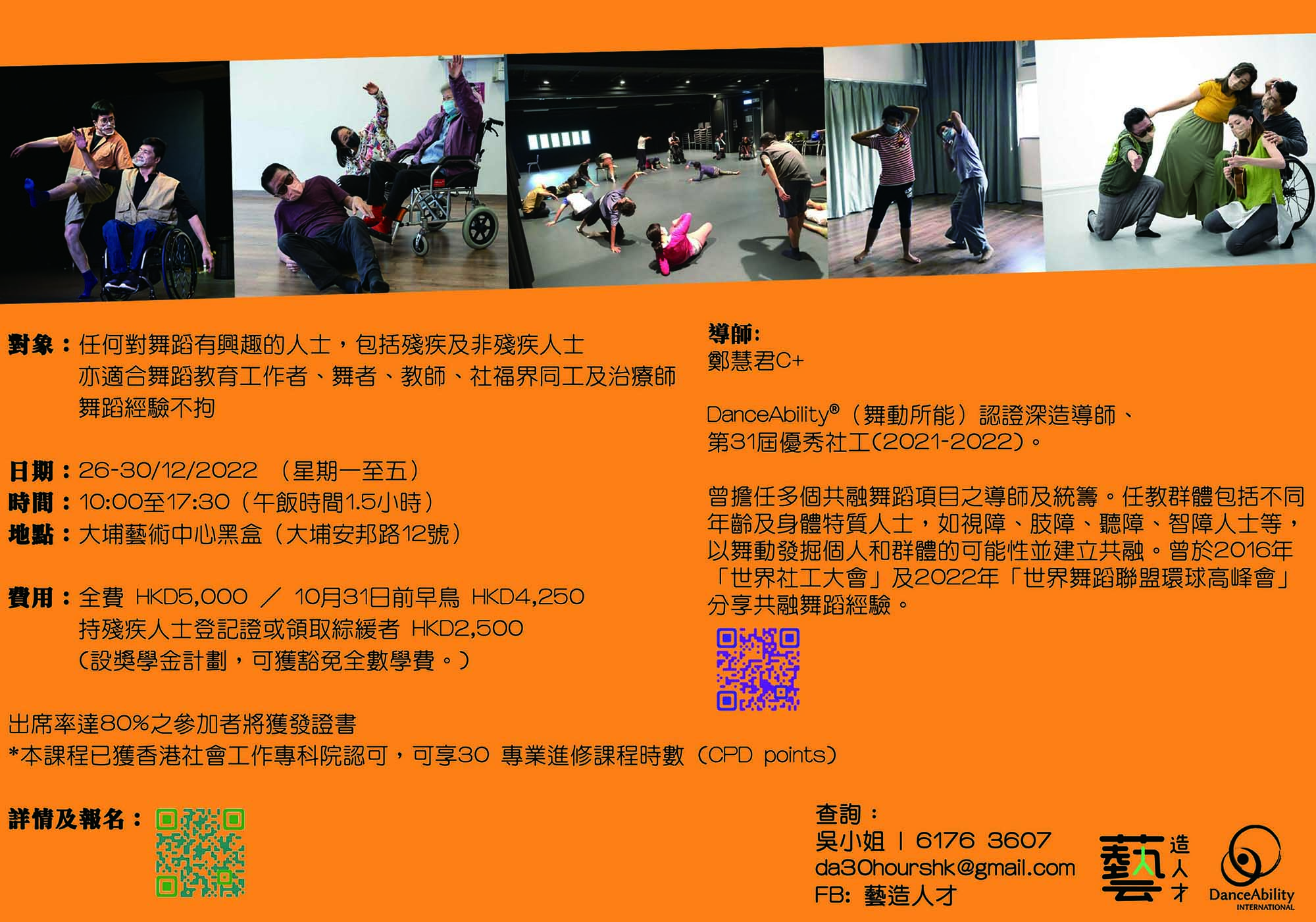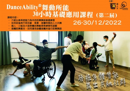 在舞動所能認證深造導師 ( Certified DanceAbility® Master Teacher ) 帶領的練習下,參加者將學習舞動所能的基本練習和理論。本課程適合任何對舞蹈有興趣的人士參與,包括殘疾及非殘疾人士,亦適合舞蹈教育工作者、舞者、教師、社福界同工及治療師,參加者舞蹈經驗不拘。課程中,參加者能享受沉浸式即興舞蹈學習經驗,而學習所得亦可應用於帶領共融及即興舞蹈活動。