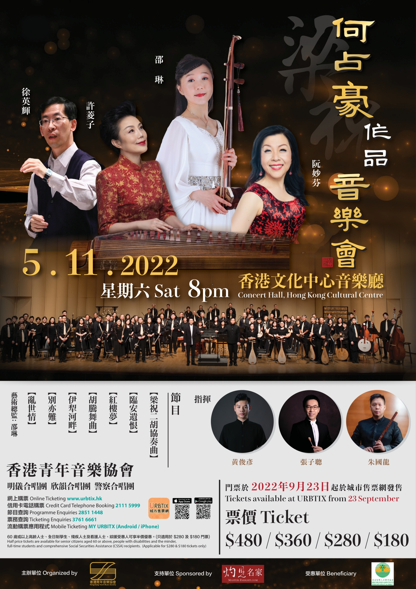 香港青年音樂協會將演奏國際著名中國作曲家何占豪教授其得意作品,包括二胡協奏曲《梁山伯與祝英台》、古箏與樂隊《臨安遺恨》、歌唱與樂隊《別亦難》、《胡騰舞曲》、《伊犁河畔》等,並邀得本地二胡演奏家邵琳,古箏演奏家許菱子教授,歌唱家阮妙芬教授,聯同明儀合唱團,欣韻合唱團,警察合唱團參演何教授作品。