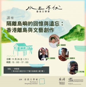 「多風光的海島,一秒⋯⋯」,有人假日瘋湧離島,有人喜歡以島民自居,香港島嶼佔香港總面積接近三成,構成香港獨特風貌,亦是不少作家藝術家創作的靈感來源。香港文學季「水土不伏」,請來兩位作家羅貴祥、張婉雯,與攝影師尹子聰,交流島嶼與香港身份的連繫,分享他們對離島的思考與創作經歷。