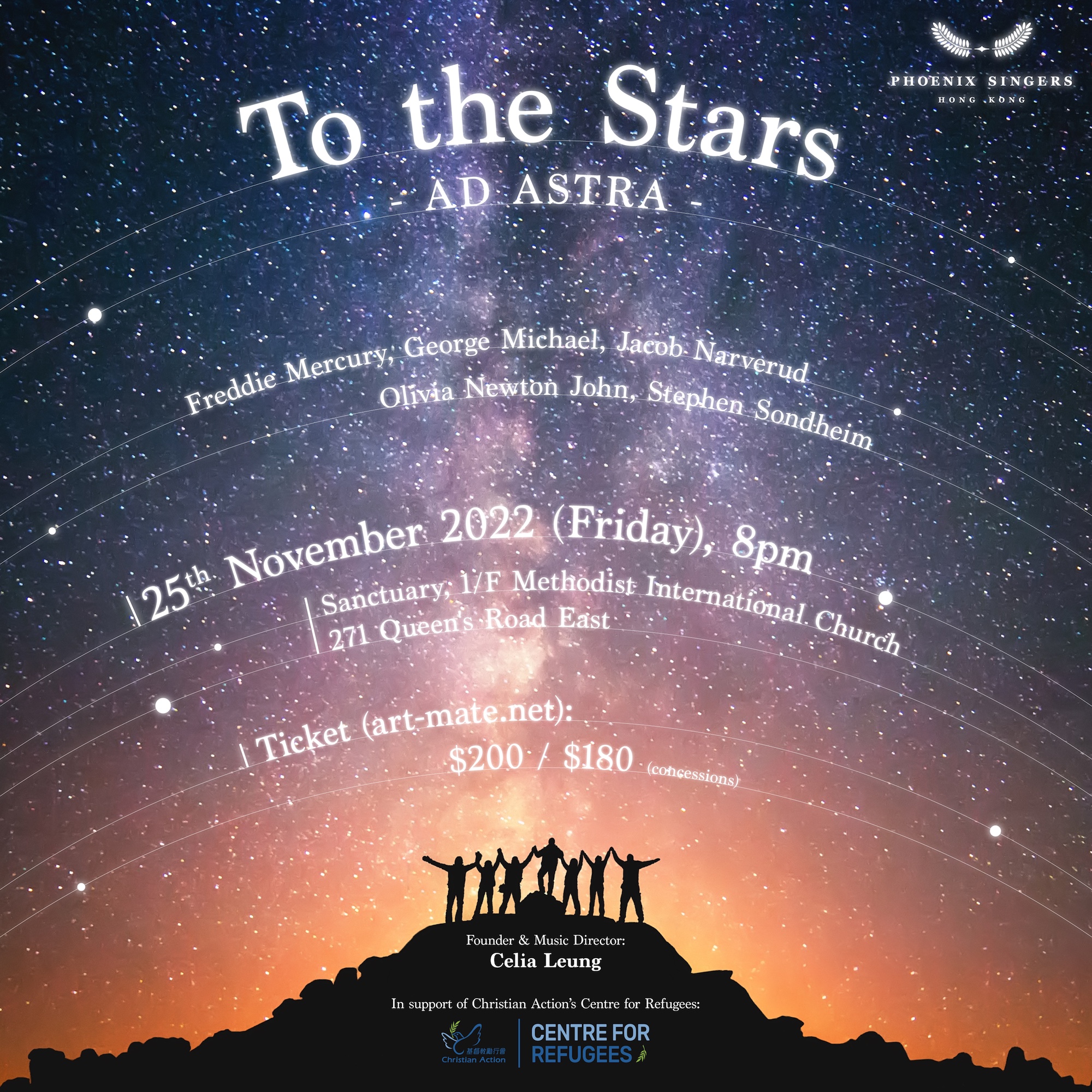 Phoenix Singers return to present a repertoire paying tribute to stars who have sadly left us: Freddie Mercury, Olivia Newton-John, Stephen Sondheim and more. Also introducing young American composer Jacob Narverud's 2019 composition "Ad astra" (to the stars)