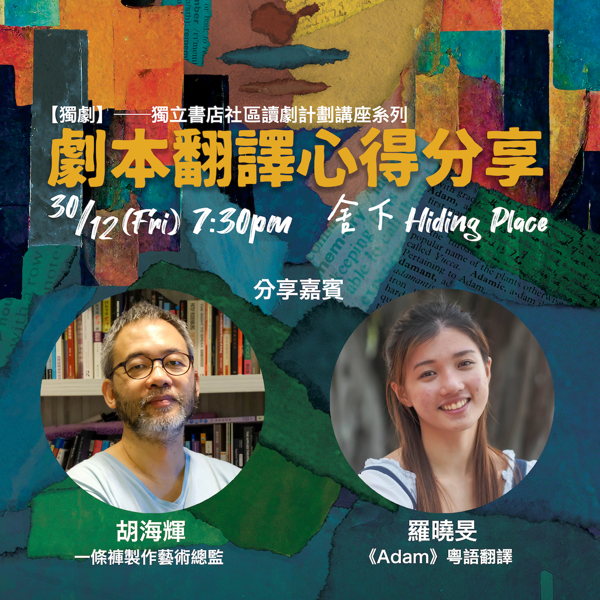 【獨劇】——獨立書店社區讀劇計劃首個演讀劇目《Adam》原為英語作品, 為推廣給不同觀眾,創作團隊特意把劇本翻譯成為粵語,分別演繹兩個語言的版本。劇本翻譯是表演藝術中重要一環,源自不同語言的作品藉著翻譯演化成為另一個文化地域的語言甚至是語境下的演出,不同背景的觀眾都可以深入感受到作品中含意。除了一般翻譯所要求的「信達雅」之餘,劇本翻譯有其特別需要注意的地方,是次活動邀請了《Adam》的翻譯指導一條褲製作藝術總監胡海輝分享他多年翻譯劇本的心得,並由《Adam》新晉譯者羅曉旻以是次翻譯經驗作出回應,讓大家了解更多劇本翻譯的美學。