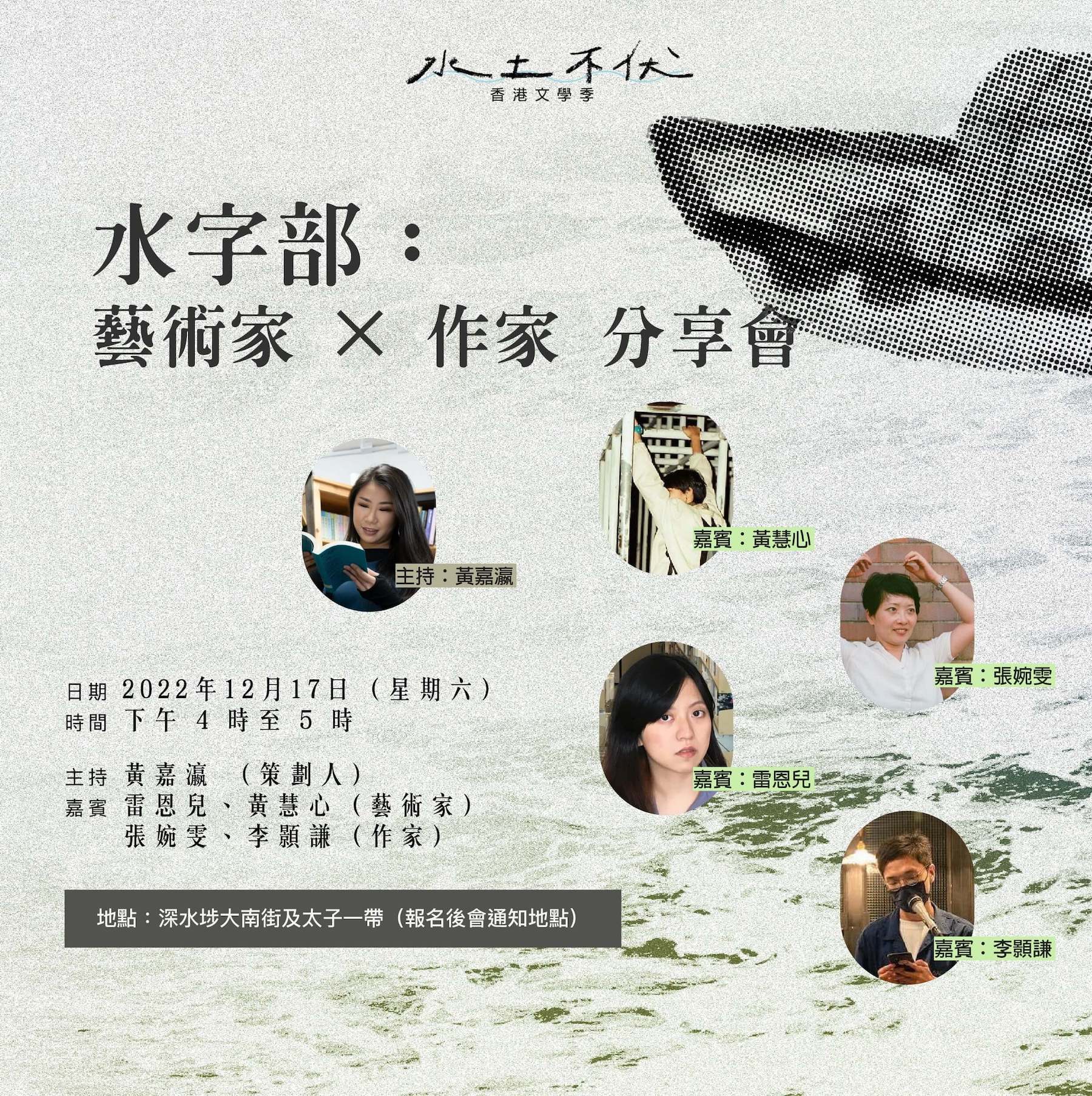 配合「 水字部:文學 x 藝術」計劃,策劃人黃嘉瀛邀來藝術家雷恩兒及黃慧心,以及作家張婉雯及李顥謙親臨計劃現場及周邊社區,以不同媒介的創作回應計劃中對水部為漢字索引中的部首之一的思考,讓人體驗文學聯乘當代藝術與的樂趣,於是次分享會訴說創作及計劃背後的意念和故事,解讀他們的文藝風景。
