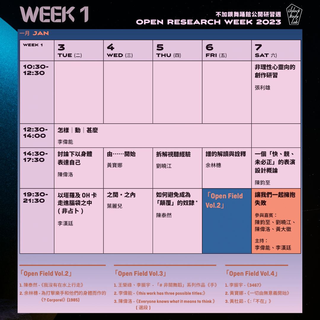 「Unlock Body Lab:公開研習週」以共學、實驗和交流為出發點,嘗試捕捉創作過程中的疑問和好奇,並命名那些鮮有描繪的未知部份,彰顯沒有放進最後成品卻依然重要的細節。第三屆公開研習週將於2023年一月再次登場,以「鍛煉創作的光譜」為主軸,策劃橫跨四星期的一系列交流活動,包括工作坊、作品分享及圓桌討論。