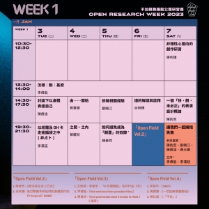 「Unlock Body Lab:公開研習週」以共學、實驗和交流為出發點,嘗試捕捉創作過程中的疑問和好奇,並命名那些鮮有描繪的未知部份,彰顯沒有放進最後成品卻依然重要的細節。第三屆公開研習週將於2023年一月再次登場,以「鍛煉創作的光譜」為主軸,策劃橫跨四星期的一系列交流活動,包括工作坊、作品分享及圓桌討論。