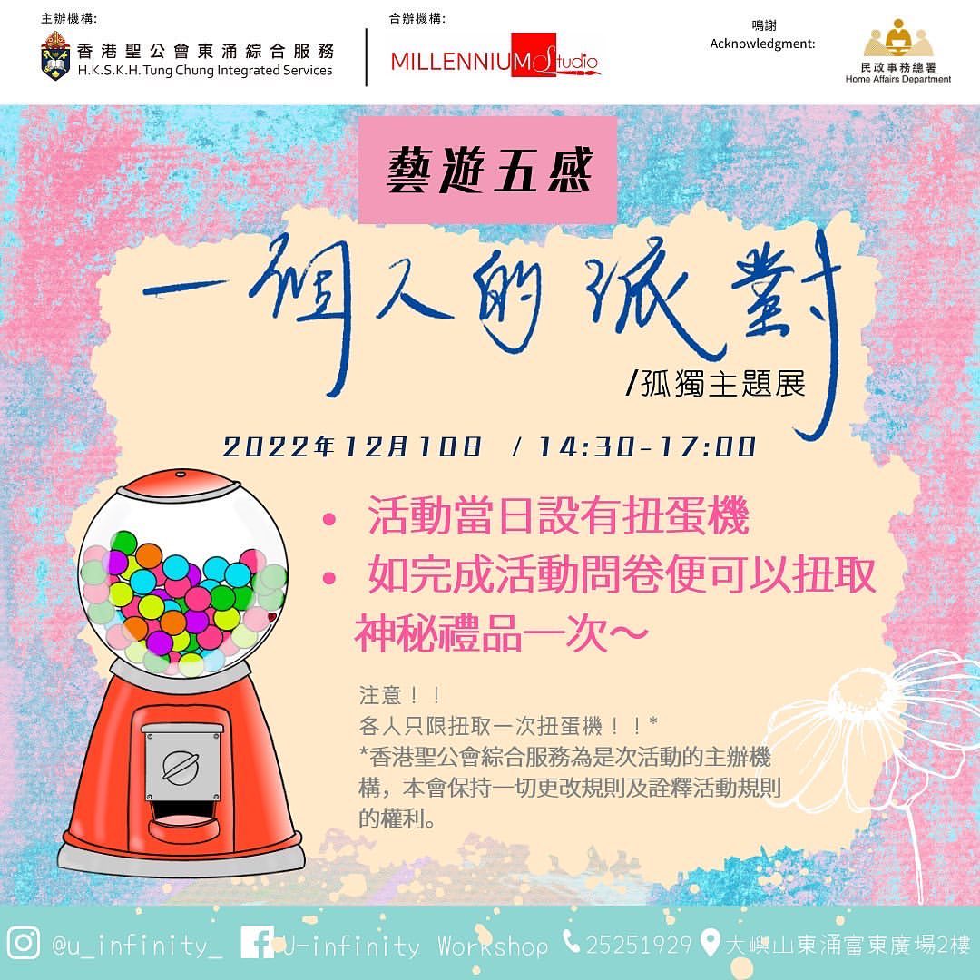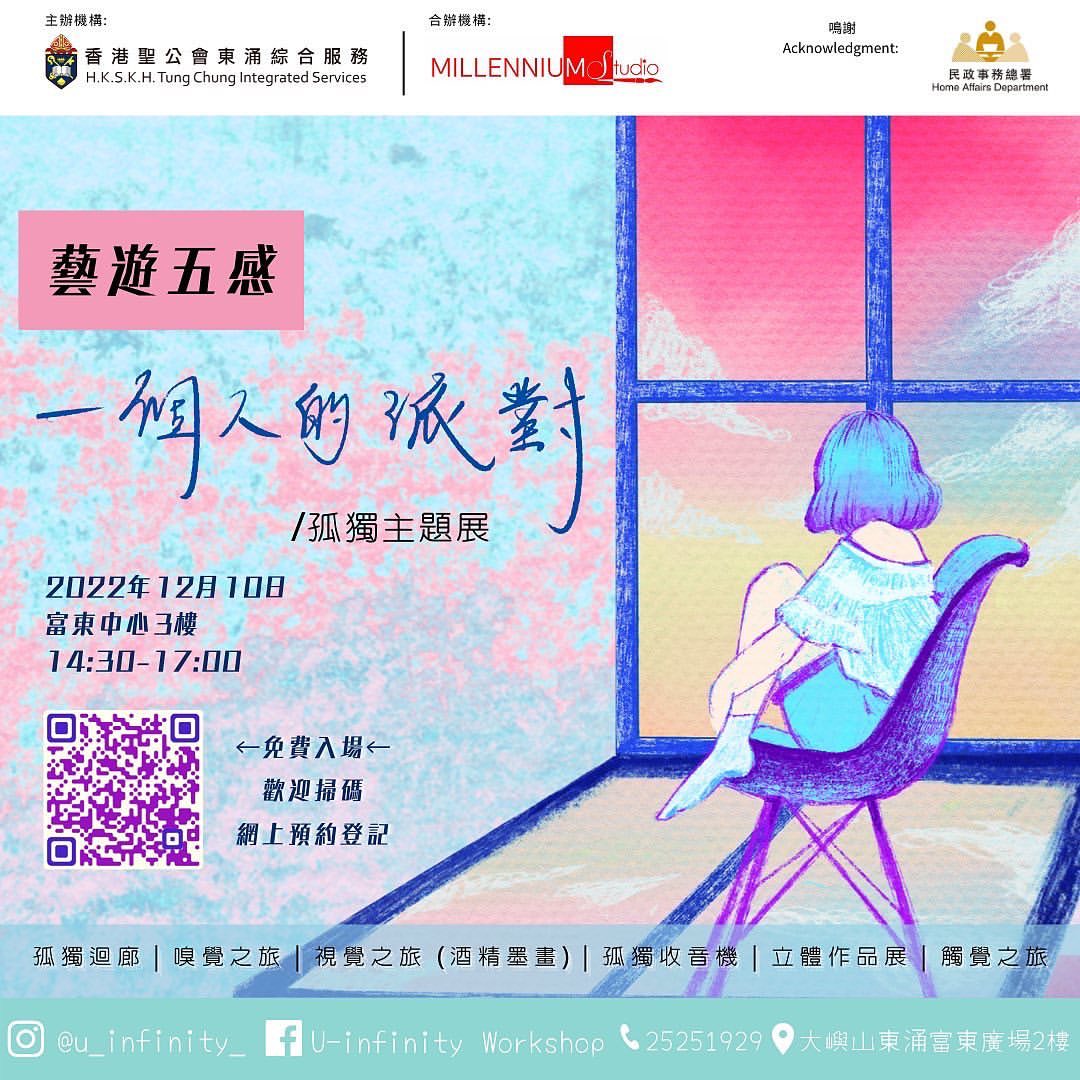 以孤獨為主題,社工和青少年共同策展和創作的主題展覽。我們在較早前舉行的五感工作坊裡收集了各式各樣的製成品,每個作品都在演繹一個人的時刻,期望藉此喚起大眾反思個人對關係的需求及自我情緒的理解。展覽期間會定時設有體驗攤位,以五感的藝術形式與大眾進一步探索孤獨。目的:1. 讓不同背景的社區人士參與,透過五感去體會「一個人」的情緒角落,聆聽社區故事,引起反思及共鳴,連結社區。2. 提升公眾對情緒的意識及關注,宣揚社區正能量。活動當日設有扭蛋機