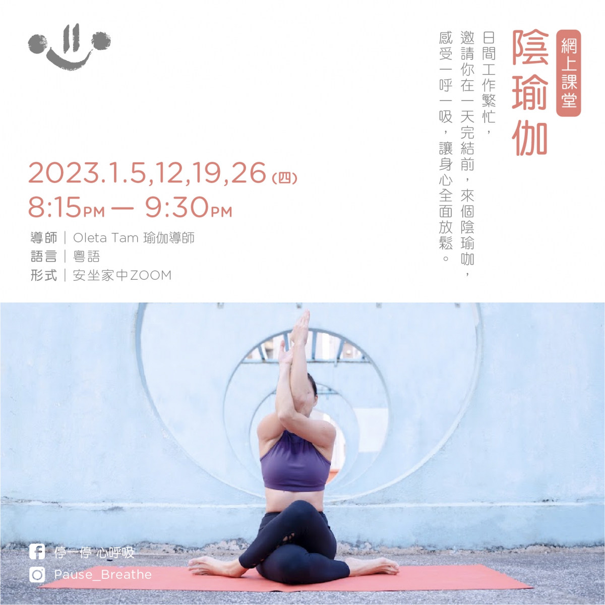逢周四晚上,透過陰瑜伽練習,一起感受一呼一吸,讓新一年開始身心放鬆!關於陰瑜伽:用以鍛鍊深層僵硬的肌肉,放鬆關節減緩老化,還能促進血液循環 ,同時加強身體柔軟度 。陰瑜伽停留的時間亦較長;動作中配合呼吸 ,試著感受每個部位,同時有靜修安神的作用。