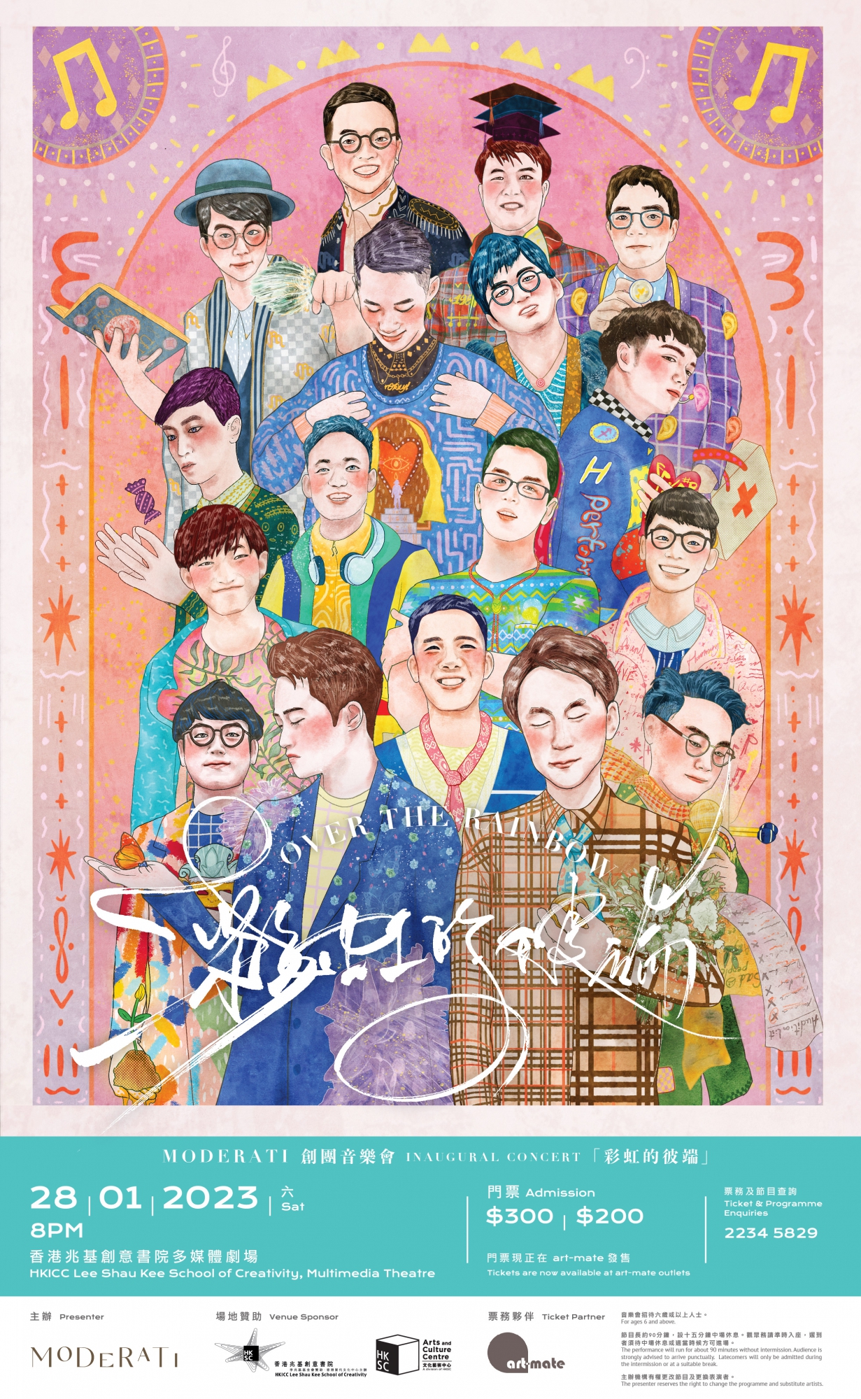 彩虹的彼端《彩虹的彼端》到底是怎樣的風景,我們也不知道。縱然眼前路荊棘滿佈,但我們仍選擇彳亍向前,互相成就大家的身後身,為的只是高唱屬於自己的一把聲音,創造理想中的風景。歡迎來到 Moderati 創團音樂會。十六位團員歷經整年洗煉,無數夜深,繼而各自進化。由第一課聲樂訓練、理論指導,及至合唱綵排,來到是夜,我們將連月以來的心血結晶,完全呈現予各位欣賞。願我們繼續敢於做夢,如青鳥自由翱翔。