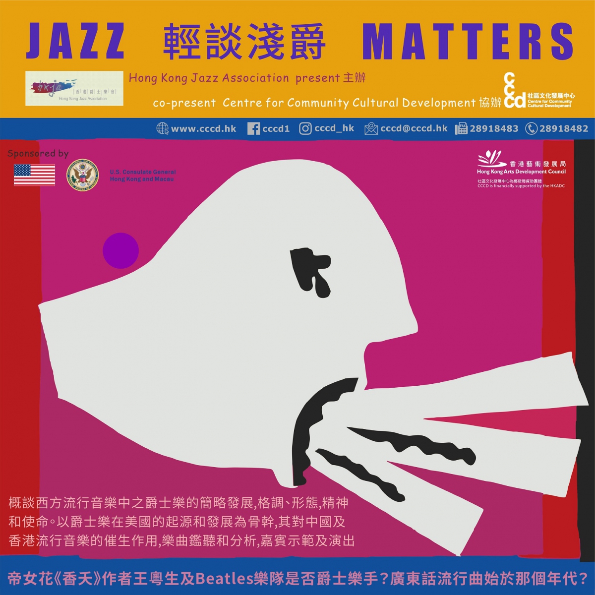 概談西方流行音樂中之爵士樂的簡略發展、格調、形態,精神和使命。以爵士樂在美國的起源和發展為骨幹,探討其對中國及香港流行音樂的催生作用,樂曲鑑聽和分析,嘉賓示範及演出。