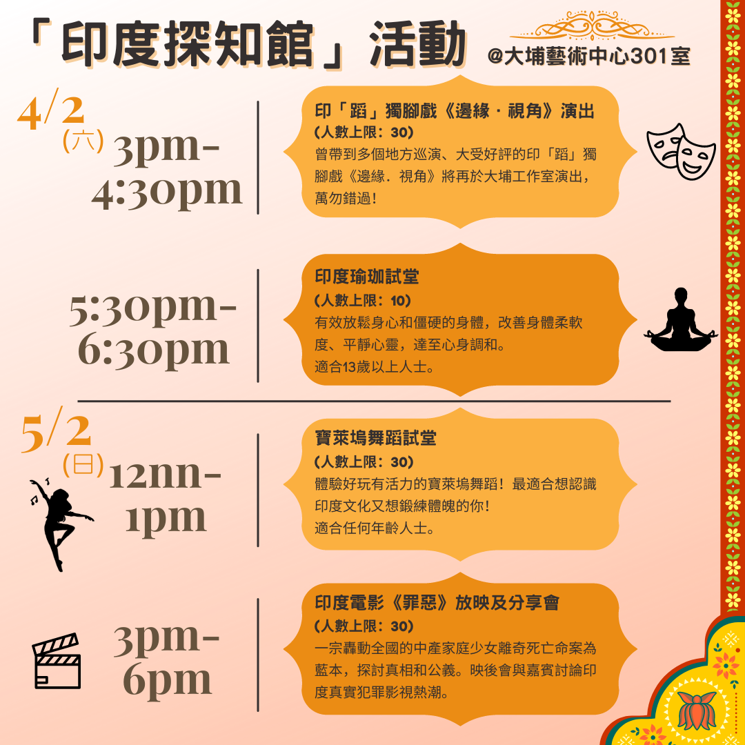 BEYOND Bollywood將於4/2-5/2,舉行一連兩日印度主題活動,帶領各位探知五彩繽紛既印度世界,黎大埔就彷彿去左一趟印度旅行!