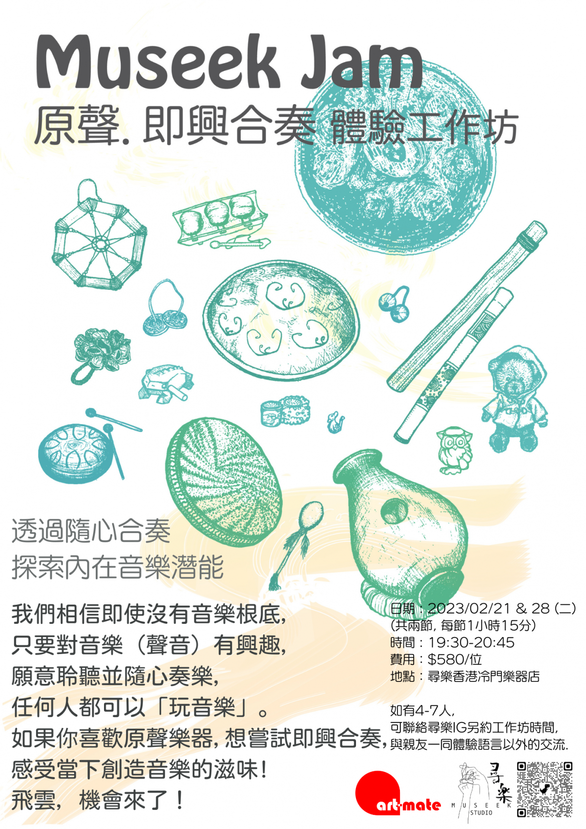 手碟、鋼舌鼓、框鼓、口弦、雨聲棒、海浪鼓、頌缽、風鈴、Agogo、 宇宙波 、木青蛙、羊咩咩、吹水雀仔⋯Museek 店內有來自世界各地的冷門樂器 ,不只外形特別,玩法也比傳統樂器自由、易學;我們相信即使沒有音樂根底,只要對音樂(聲音)有興趣,願意聆聽並隨心奏樂,任何人都可以「玩音樂」。如果你喜歡原聲樂器,想嘗試即興合奏,學習基本合奏技巧,感受當下創造音樂的滋味,飛雲,機會來了!