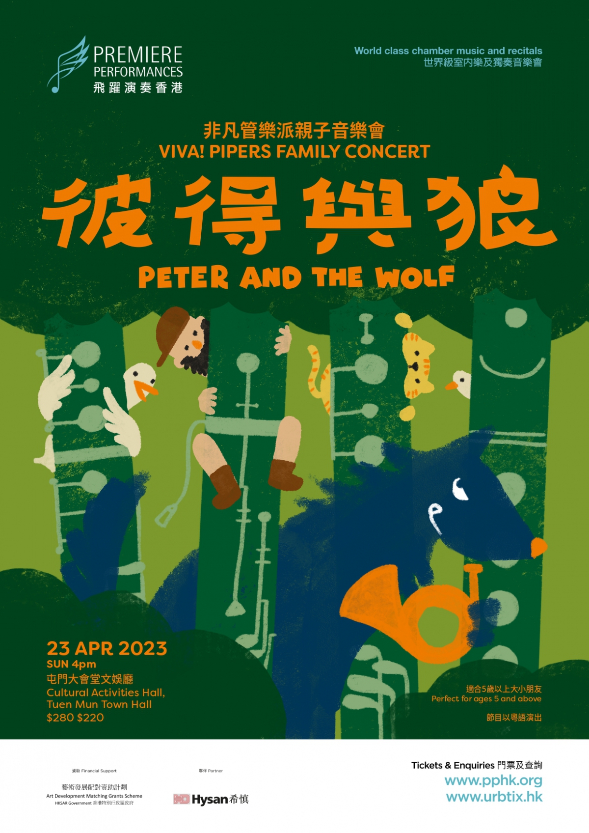 非凡管樂派 Viva! Pipers載譽重演浦羅歌菲夫的經典之作——彼得與狼!這套交響童話運用了不同的木管樂樂器來刻畫每個角色和故事情節。故事講述少年彼得逃離了爺爺的家,走進森林並遇到狼,最後在朋友——小鳥、鴨子和貓的幫助下,成功抓住狼,並把牠送進動物園。是次親子音樂會的其他精彩曲目包括多首耳熟能詳的親子音樂,由傳統民謠,古典音樂,到電影主題曲及動畫音樂。五位樂手將為小朋友講故事,讓他們發揮無盡的想像和創意空間,經歷一個愉快的音樂旅程,不容錯過!
