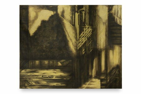 同樣是取材自其個人藏有的照片庫,Raissnia的畫作亦參與了這場素材的變革過程。在過去的 二十年間,Raissnia不斷探索靜止與運動、再現與抽象之間的張力,打造充滿活力的情感空 間,作家Milton Cruz 稱之為「心靈一種有機生活空間的體驗調製」。自她之手,在傳統意義 上指向著凍結時間的畫布平面變為一個自相矛盾的電影空間,並在她痕跡創作的能量和密度 激活下栩栩如生。作品如「Tympanum」和「Doric」棲身於具象和抽象間的間隙區域,壓縮多 種時空景況進單一的巴洛克式建構。在這些攝人心神的畫面裡,能辨認出的主題如迴廊、浮 雕和塔架等似乎在觀者的感知中來回顫動。它們的特點既有一種循環的內部運動,也有一種 在對閃爍、振動和耀光的繪畫類比編排中近似於實驗電影形式語言的搭造。寬幅彩色作品如 「Scholiastic View」中強烈的密度與如功筆般細膩的線條使畫作表面注滿了閃耀、振動的特 質。這些新作品畫面中滿佈彷如突觸或電路的形態,可視作為一種模控學的蔓藤花紋,未來 與古老的合二為一。