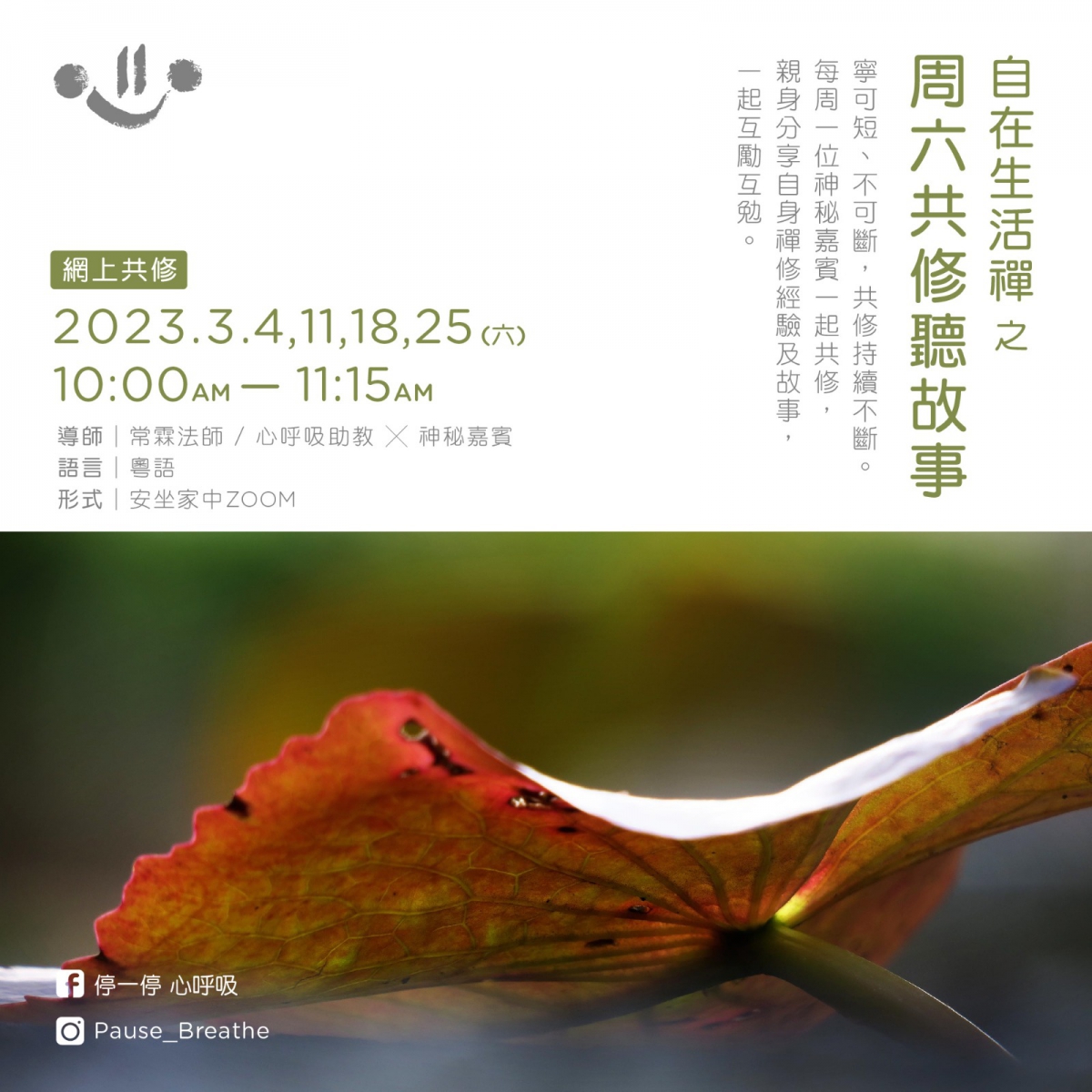 每個周六早上,不論萬里晴空或烏雲蔽日,我們都邀請你透過共修力量,「寧可短、不可斷」地持續修行 !----------------------------------「自在生活禪」共修持續不斷,每周邀請一位神秘嘉賓一起共修,並由他們親身分享自身禪修經驗及故事,一起互勵互勉。