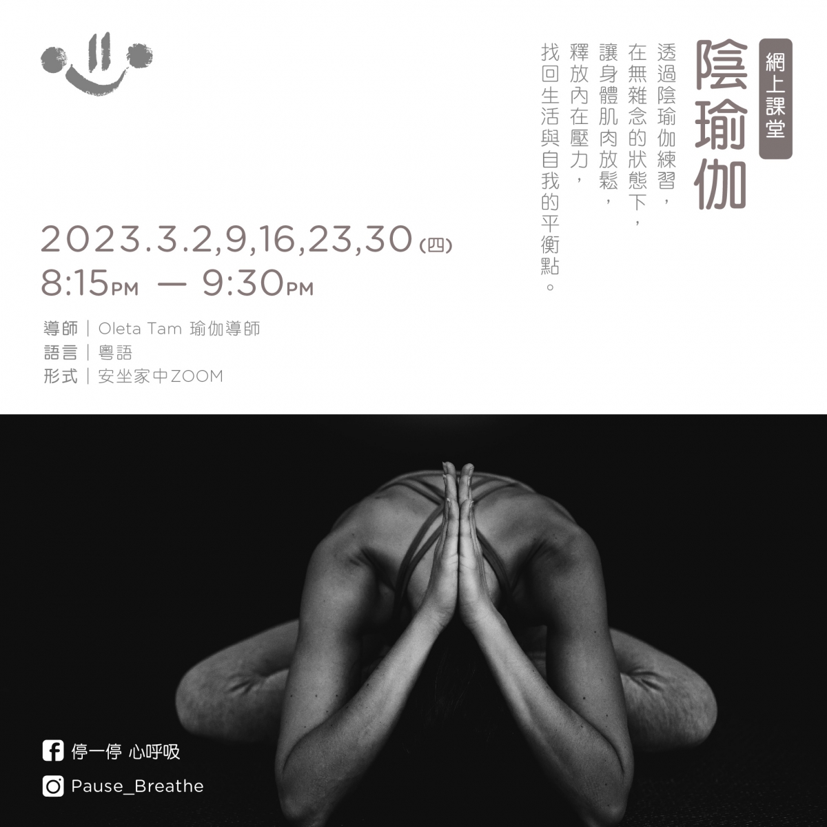 透過陰瑜伽練習,在無雜念的狀態下,讓身體肌肉放鬆,釋放內在壓力,找回生活與自我的平衡點。關於陰瑜伽:用以鍛鍊深層僵硬的肌肉,放鬆關節減緩老化,還能促進血液循環,同時加強身體柔軟度 。陰瑜伽停留的時間亦較長;動作中配合呼吸,試著感受每個部位,同時有靜修安神的作用。