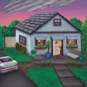 藝術家曾有不愉快的住房經驗,因此在腦海中幻想出一個她可以逃避現實不快的「b-roll」世界。畫作描繪的郊區謐靜,有著盆栽、小狗和亮麗的汽車。房子半拉的百葉窗後透出溫暖的光線,暗示著屋內舒適溫馨。而屋外周末的草坪被修剪得整齊,懸崖佇立。夏季周末的日子裏,住客們都可在草地上和崖邊燒烤野餐。