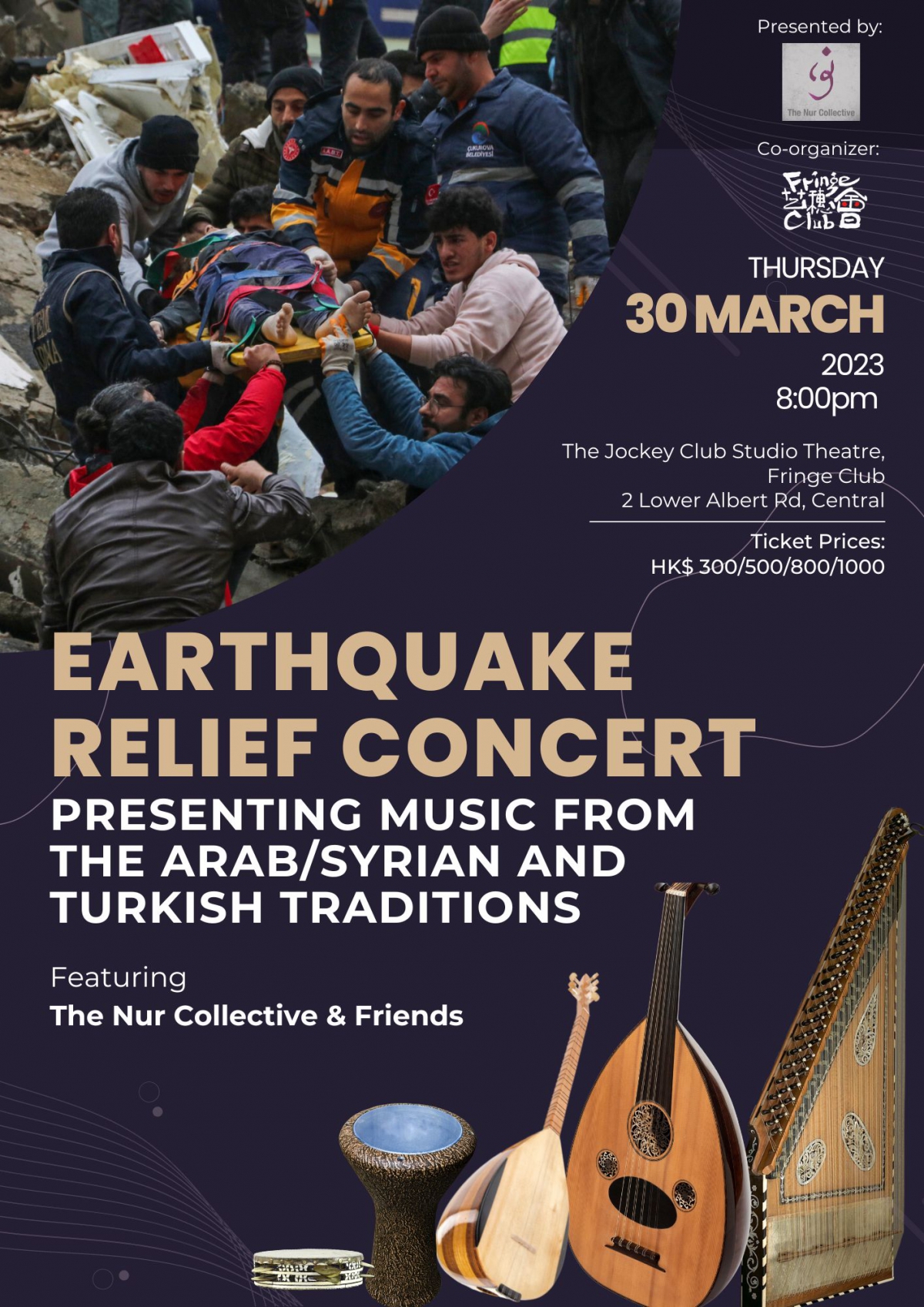 Syria and Turkey, the two countries most affected by the earthquake on 6 Feb 2023, are homes to rich musical heritages, including regional folksongs and art music from shared roots in the Ottoman Empire. The Nur Collective & friends will lead you on a journey to discover some of most beloved classics in these traditions, performed on common instruments in the region such as the lutes oud, bağlama, the zither qanun, and the drums darbuka and riqq.